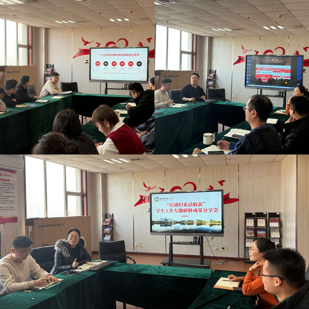 会上,四位辅导员代表先后结合外出培训所学作交流分享。项阳围绕“AI赋能高校学生工作”,介绍了人工智能辅助日常工作的实操方法;范煜从课题申报入手,强调应紧扣国家战略、结合专业实际明确研究方向;苏晓迪借鉴合肥工业大学经验,对一站式学生社区建设提出优化建议;李建华则通过“就业指导灵魂五问”分享了就业工作的新思路与新方法。