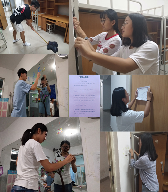 珍惜新起点,笑迎新生活。在新生到来之前,外语系学生会成员认真清扫、装饰新生宿舍,设计了精美英文门贴,并在宿舍墙壁上贴上温馨而励志的英文句子、单词,营造出浓郁的外语文化氛围。宿舍门内张贴了《欢迎小萌新之老师有话对你说》,上面记录着任课老师们对新生的祝福和殷切期望。各宿舍内还放置了绿植种子和花盆,代表着蓬勃向上的青春朝气。在宿舍大厅,工作人员们也精心装扮了公用镜子,摆放了外语系宣传易拉宝,介绍外语系优良学风、系风,表达了对2018级新同学的衷心欢迎。