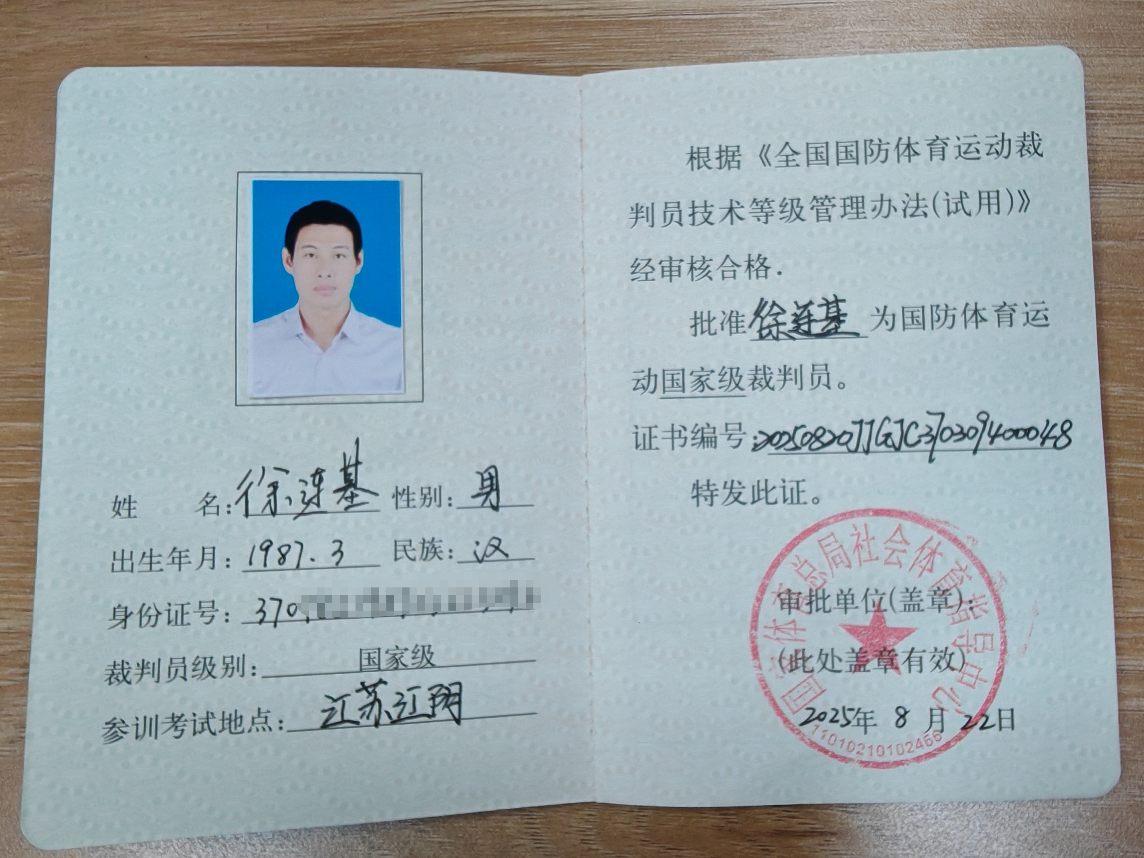 日前,国家体育总局社会体育指导中心颁发了首批全国国防体育国家级教练员、裁判员证书,高密校区辅导员徐连基获颁首批全国国防体育国家级裁判员证书。